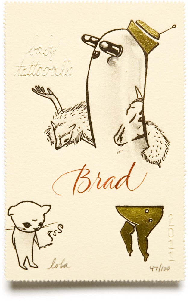 We produced this badge in conjunction with Baby Tattooville for their 2011 weekend extravaganza. The edition was printed in relief with embossed type and foil-stamped gold on perforated Rives BFK printmaking paper. Each Baby Tattooville attendee’s name was hand-lettered onto a badge by a professional calligrapher, with the badge serving as a name-tag throughout the event.