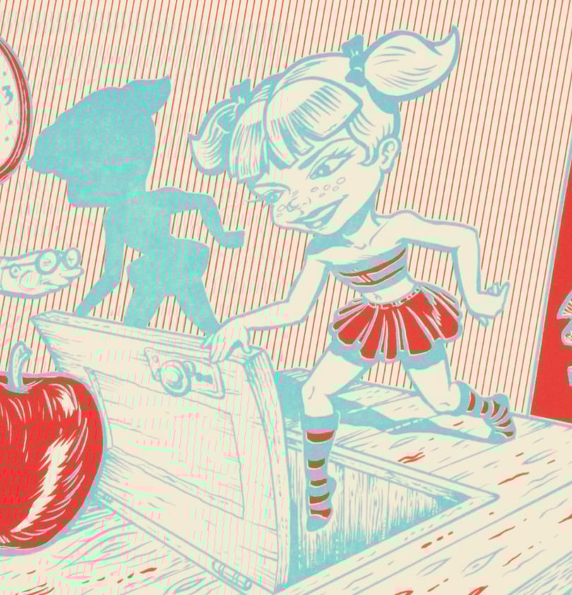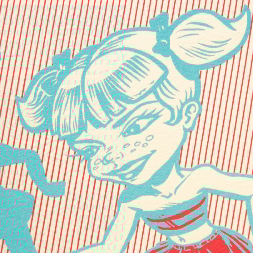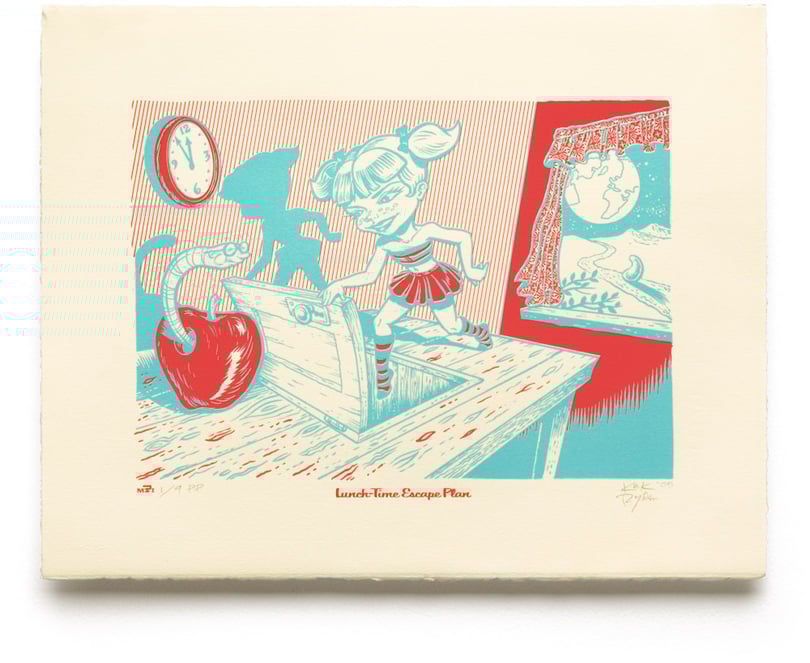 Lunch-Time Escape Plan—the first print in a collaborative series with KRK—was made from an original and exclusive drawing. The image has been relief-printed in two colors onto Rives BFK printmaking paper and comes with a special pair of foil-stamped 3-D glasses that literally make the image leap off of the page.